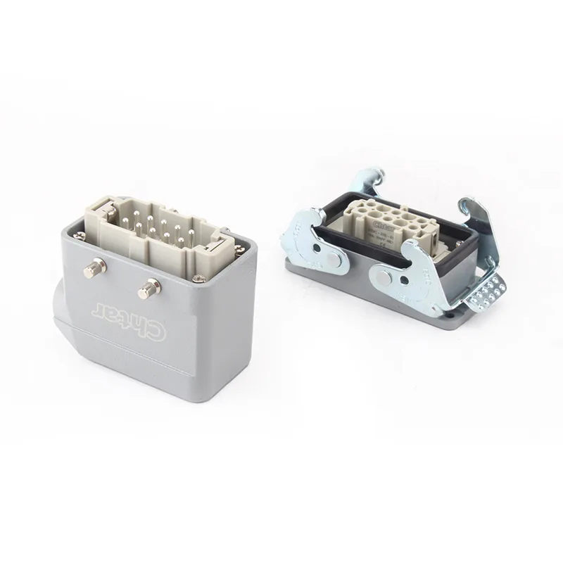 Бұл CHTAR 10 Pin AG ауыр жүк қосқыштары модульдік принцип бойынша жасалған. Ол 10 сандық әйел немесе еркек контактілері бар әртүрлі кірістіру конфигурацияларын орналастыра алатын әйел розетка корпусынан тұрады. Ол ішкі қосқыштарды қорғау үшін қос құлыптау рычагынан жасалған.